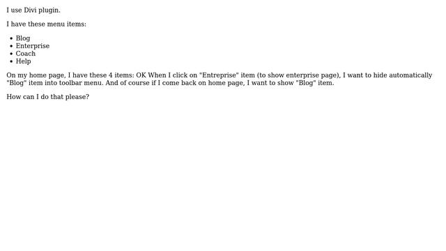 Wordpress: Divi: how to hide/show specific menu according current page? Helpful? Please support me on Patreon: https://www.patreon.com/roelvandepaar With thanks & praise to God, and with thanks to the many people who have made this project possible! | Content (except music & images) licensed under CC BY-SA https://meta.stackexchange.com/help/licensing | Music: https://www.bensound.com/licensing | Images: https://stocksnap.io/license & others | With thanks to user Ivan Shatsky (wordpress.stackexchange.com/users/124579), user Anthony (wordpress.stackexchange.com/users/191312), and the Stack Exchange Network (wordpress.stackexchange.com/questions/370666). Trademarks are property of their respective owners. Disclaimer: All information is provided "AS IS" without warranty of any kind. You are responsible for your own actions. Please contact me if anything is amiss at Roel D.OT VandePaar A.T gmail.com