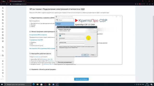 Содержание ролика: 00:00 Начало 00:02 Вступление 00:12 Установка КриптоПро CSP 5 00:49 Установка сертификата 02:32 Ввод лицензии КриптоПро CSP 5 03:20 Установка Моё Дело.Плагин 03:59 Регистрация ЭП в сервисе «Моё дело» 05:17 Дополнительная информация для токенов с пин-кодом