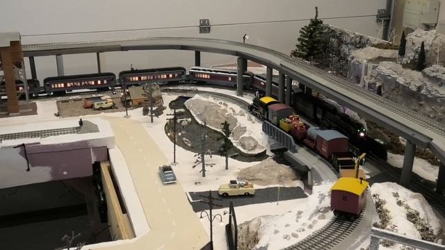 Getting the Elf Work Train to the North Pole Scene on my layout is complicated. The Elf Work Train must maneuver around two larger Polar Express trains to reach its goal. So how does the Elf Work Train get to the North Pole with two Polar Express trains in its way? Well, it’s complicated! In this video, I’ll maneuver three trains to get the Elf Work Train from Track Number 3, my elevated track, down to the North Pole scene on Track Number 1. And we’re starting right now. Hi. I’m Owen. If you enjoy watching electric trains maneuvering in operating sessions, I think you’ll like this video. In addition to operating sessions, I do frequent new product reviews and demonstrations. I’m also continuing to build, expand, and improve my Polar Express Layout. I demonstrate how to build a layout with easy, step-by-step demonstrations. If you want to see more videos like this, please consider subscribing to my YouTube channel. Also, like this video and comment below. I want to get the Polar Express Elf Work Train down from Track 3, my elevated track, to the North Pole Scene on Track 1. Track 3 connects with Track 2 at the bottom of the grade. However, the Polar Express Passenger Train is on Track 2. A pair of Remote Control O-36 switches connects Track 2 with Track 1 on the east side of the layout. Another pair connects 1 and 2 on the west side of the layout. Track 1 is occupied by the Polar Express Freight Train. To get the Elf Work Train to the North Pole scene, I have to get around the other Polar Express trains. Through the maneuvers necessary to reach the goal, I’ll be controlling the three trains using the LionChief App on my iPad Mini. I’ll explain what I’m doing each step along the way. I’m going to begin by starting down the grade with the Elf Work Train. I’ll throw the switch to exit from Track 3, and then head down the grade toward Track 2. I’ll park on the grade and disconnect the Elf Work Train from the App. Then I’ll connect the Polar Express Berkshire pulling the passenger train. Next I’ll reposition the passenger train so that the Elf Work Train can get past it. The passenger train is now in position. I’ll disconnect it from the App, and connect the Pere Marquette Berkshire pulling the freight train, so that I can also reposition it to allow the Elf Work Train to pass. Now both the passenger and freight trains are properly positioned. I’ll disconnect the Pere Marquette from the App and connect the Elf Work Train. Before I can pull, I need to throw five switches for the train to get around the passenger and freight trains and reach the North Pole scene. Now it’s time to take the Elf Work Train back up the grade to Track 3.