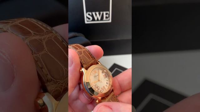 The Chopard Happy Sport line combines the brand’s iconic diamond designs, with a modern, sporty look. This special model comes with their iconic "floating diamond" design, with round diamonds freely moving between the dial and the sapphire crystal. A mesmerizing timepiece every woman will love. Check out our collection of Chopard watches for men and women at SwissWatchExpo. Chopard Happy Sport 7 Floating Diamond Rose Gold Ladies Watch 7471: 18K rose gold round case 36.0 mm in diameter. Crown set with the blue sapphire. Solid case back. 18K rose gold bezel. Mother of pearl dial with with 7 trademark "Happy Diamonds" floating between the dial and sapphire crystal. 18K rose gold sword shape hands and Roman numerals at the 3, 6, 9 and 12 o'clock. Date window at 5 o'clock. Brown leather strap with 18K rose gold tang buckle. Featured watch (prices may change): Chopard Happy Sport 7 Floating Diamond Rose Gold Ladies Watch 7471 https://www.swisswatchexpo.com/watches/chopard-happy-sport-7-floating-diamond-rose-gold-ladies-watch-7471-40164/ Please Subscribe to get updates ▶️ https://swisswatchexpo.click/YouTube More 1-minute Watch Reviews: https://swisswatchexpo.click/1min-watch-reviews More In-Depth Watch Reviews: http://swisswatchexpo.click/fresh-from-the-showroom-floor Instagram: http://instagram.com/swisswatchexpo/ Shop watches here: https://www.swisswatchexpo.com — Transcript: Ahh the holidays! The Chopard Happy Sport. Now these come in a lot of different flairs, flavors and styles, but this one of course has the traditional diamond in the glass that separates the two areas between the dial and the outer portion of the watch, these dance gracefully across the dial. I'm trying to do this in a very delicate manner because they do have a mind of their own, obviously. Mother of Pearl dial on this watch solid gold, absolutely gorgeous. It's a 36 millimeter watch, but it wears a little bit smaller, probably more like a 35 does have this factory service sticker on it from show barred. What a gorgeous watch, beautiful strap. Obviously you can get other straps. If you don't particularly care for that color, it has the sapphire in the stem as well. Just beautiful. It's a barely worn strap. Actually it looks more unworn than anything. Find that it's SwissWatchExpo.com. This makes a beautiful gift for the holiday and a happy, happy new year. And you see those diamonds just dance across the dial. #Chopard #ChopardWatches #ChopardWatch #Watches #LadiesWatches #LuxuryWatches #SwissWatches