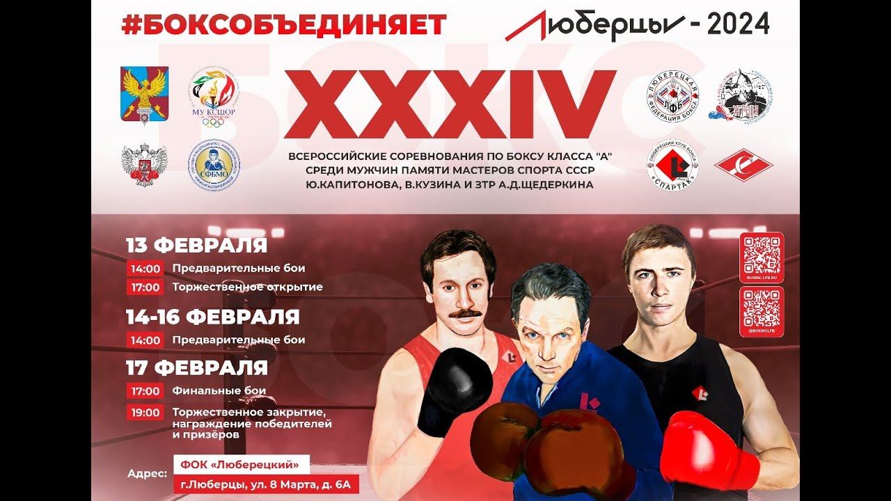 XXXIV Всероссийские соревнования по боксу среди мужчин 19–40 лет (2005–1984 г.р.) памяти мастеров спорта СССР Ю. Капитонова, В. Кузина и Заслуженного тренера России А.Д. Щедеркина Подписаться на канал: https://www.youtube.com/c/RussianBoxingFederation/?sub_confirmation=1 Федерация бокса России: http://rusboxing.ru/ ВКонтакте: http://vk.com/rusboxing Телеграм: http://t.me/RussianBoxers Одноклассники: http://ok.ru/group/64339915505917/ Дзен: https://zen.yandex.ru/rusboxing Состав пар 1/56 ЧЕРЕЗОВ Иван Кировская обл. БЕЛОВ Дмитрий Вологодская обл. 2/57 ГУРБАНОВ Супхан Вологодская обл. ТАРАСОВ Владимир г. Санкт-Петербург 3/58 ГУЛЯЕВ Юрий г. Санкт-Петербург ГОЛИКОВ Максим Орловская обл. Весовая категория 54 кг 4/59 БЕКИШЕВ Аминтаза Владимирская обл. ЖЕНИШБЕКОВ Нурислам г. Москва 5/60 ВАРОСЯН Артур Ивановская обл. ЧЕКОТИН Александр Пермский кр. 6/61 АЙДУЛЛИН Ильнар р. Башкортостан ИЛЬЗИТИНОВ Богдан р. Калмыкия Весовая категория 57 кг 7/62 ТКАЧЕНКО Максим г. Москва ГУБАЧЁВ Кирилл Воронежская обл. 8/63 АНУФРИЕВ Евгений г. Санкт-Петербург ЗАКОРОЕВ Ибрагим Ростовская обл. Весовая категория 60 кг 9/64 ВАРОСЯН Армен Ивановская обл. ЦЕНЕНКО Сергей Ростовская обл. 10/65 АБДУВАЛИЕВ Муроджон г. Москва ХРЯШКО Даниил Пермский кр. 11/66 ТАРАМОВ Турпал г. Москва АСЛАНЛЫ Хазар г. Санкт-Петербург 12/67 ПЕТРОВ Богдан р. Башкортостан ПЕТИН Никита г. Москва Весовая категория 67 кг 13/68 ИСМАИЛОВ Шамил г. Санкт-Петербург МОИСЕЕВ Артём Воронежская обл. 14/69 МОГИЛЬНЫЙ Владислав Вологодская обл. ХАЧАТРЯН Арцруни Московская обл. 15/70 СЕФЕРОВ Ата-Султан Астраханская обл. ЖУКОВ Андрей Архангельская обл. 16/71 КАЧАРАВА Саир г. Москва КАРИМОВ Орхан Волгоградская обл. Весовая категория 71 кг 17/72 ГЕТАГАЗОВ Магомет г. Москва НАЗАРЧУК Александр Московская обл. 18/73 ИСАЕВ Азер р. Башкортостан КОРОЛЬКОВ Глеб Тверская обл. 19/74 ПУГОЕВ Хизир г. Москва ХАСАНОВ Роман р. Башкортостан 20/75 КУРЧИЕВ Леон Московская обл. БЕЛОВ Даниил Ярославская обл. Весовая категория 75 кг 21/76 ТАМБОВ Константин Вологодская обл. ДЕНИСОВ Алексей г. Москва 22/77 ВАРАКИН Матвей Московская обл. ПОСТНИКОВ Алексей Московская обл. 23/78 ГУРОВ Николай г. Москва МИНКЕВИЧ Николай г. Санкт-Петербург 24/79 ДОЦЕНКО Матвей Московская обл. РОМАНЧУК Иван г. Севастополь #бокс #boxing