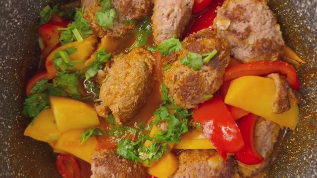 Фрикадельки с овощами в соусе : 500 гр фарша 1 яйцо 2 ст.л. панировочных сухарей одна тертая луковица пол ч.л. соли, черного перца 30 г сливочного масла 2 ст л растительного масла 1 красный болгарский перец 3 картошки среднего размера 1 луковица среднего размера 2 зубчика чеснока 1 ст л томатной пассаты, смешанной с водой 350 мл , одной чайной ложкой соли придайте форму фрикаделькам, обжарьте их с обеих сторон на среднем огне, затем обжарьте овощи, залейте соусом и готовьте с закрытой крышкой на среднем огне в течение 30 минут.