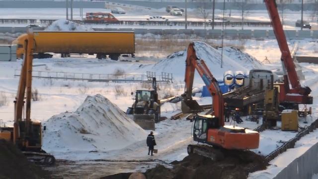 Грузовичок шаланда подвезёт шпунт к стройплощадке зимой