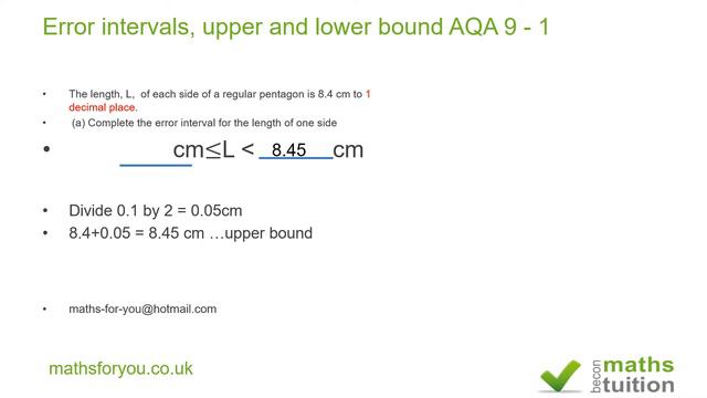 The length, L, of each side of a regular pentagon is 8.4 cm to 1 decimal place. (a) Complete the error interval for the length of one side (b) Complete the error interval for the perimeter.