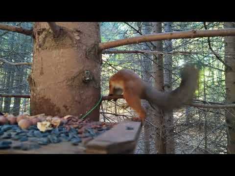Белки в ельнике на кормушках