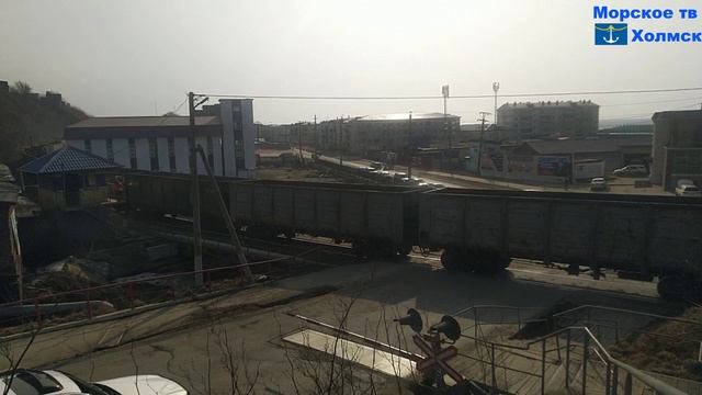 Грузовой состав поезда на северном ж. д. переезде города Холмск