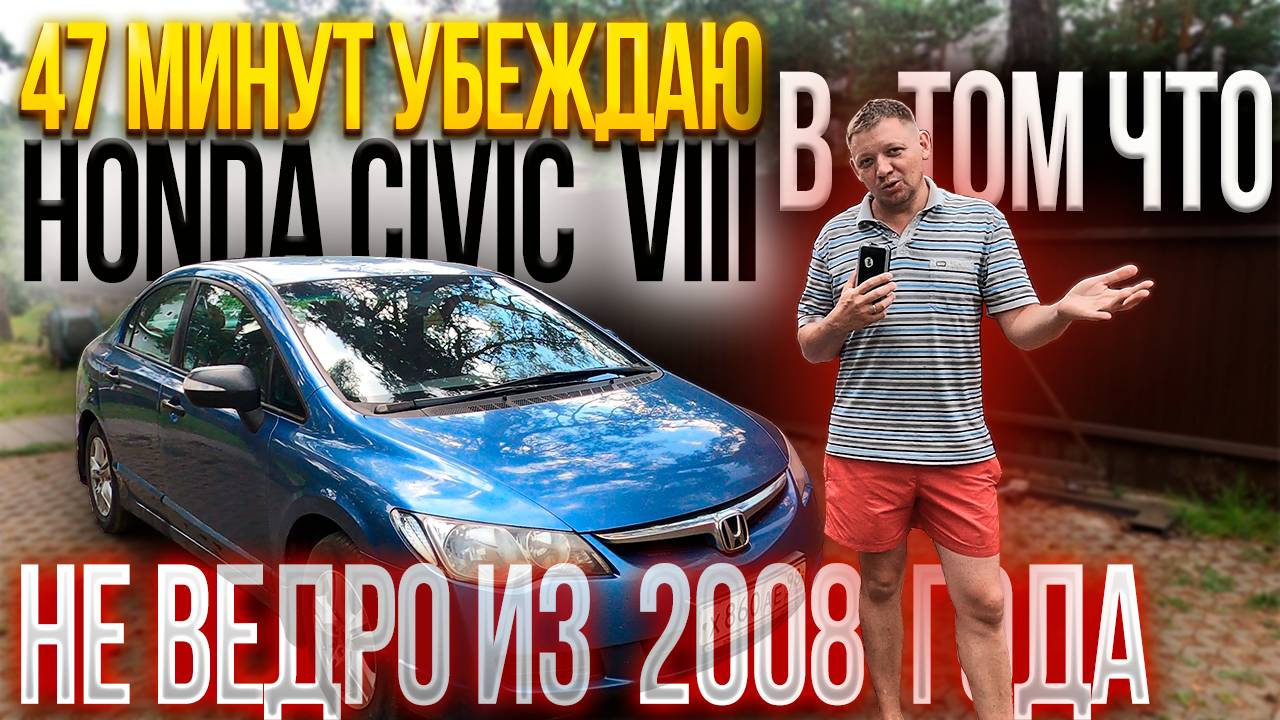 Сегодня у нас с вами будет обзор Honda Civic VIII поколения и на протяжении 47 минут этого видео, я буду убеждать зрителя в том, что Honda Civic не ведро из 2008 года, а один из лучших автомобилей в своём классе... А если по честному? Так сказать взглянуть на автомобиль обьективно, как на 17 летний авто, давным давно выехавший из автосалона. Да, это старая Honda Civic, она не современна, не актуальна, а ещё она из эпохи, когда мы с вами могли себе позволить купить хороший новый автомобиль, с настоящей гарантией, за смешные, по современным меркам, деньги. То есть, honda civic это раздражитель для современных автомобилистов - напоминание о том, что у нас когда-то было и чего уже не будет. Она ржавая, старая, в любой момент у honda civic может отказать любой агрегат, какая бы надёжная и конструктивно простая она не была, я всё это прекрасно понимаю и предвижу всякие нравоучительные комментарии, наверняка будут и оскорбительные, и вот знаете что? Я со всеми, всеми зрителями согласен! Я согласен с теми, кто скажет, что Honda Civic классный авто, я согласен с теми, кто считает его ведром, у меня, как и у большинства людей бывает разное настроение и разное восприятие одного и того же автомобиля. Но из видео в видео, я стараюсь смотреть на любой автомобиль именно с позитивной стороны, какое бы у меня настроение не было и могу сказать, что в Honda Civic положительных эмоций гораздо больше, чем всего остального, в этом и есть сила Honda Civic!!!