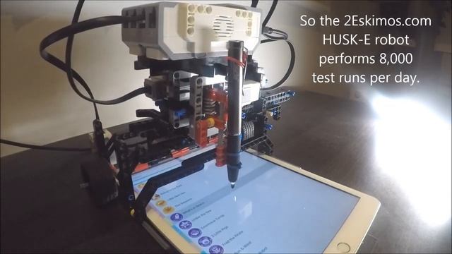 All 2Eskimos Apps are testing by these dedicated robots. Created by 2Eskimos own in-house engineers using the LEGO MindStorms EV3 Package. The testing programs are written in Microsoft Small Basic with the EV3Basic plugin. The bots use a grounded "active stylus" to achieve a precision tap on the capacitive screen.