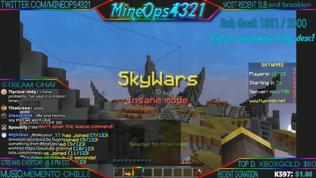 Read the description for cool stuff G2A: https://www.g2a.com/r/mineops Giveaway: https://gleam.io/mOcTJ/50-hypixel-giveaway SMP: https://goo.gl/forms/f79zkkP5MwsT6krX2 Suggest Songs: https://goo.gl/forms/VYyTTBEMIQK2b6ts2 Suggest Texture Pack Changes: https://goo.gl/forms/ewlSuUNTTUFxY92J2 Say your IGN to be invited! We may still play more than SkyWars! Please, be kind in the chat, no drama is wanted/needed! Please also be PG in chat! Commands: !donate !sr !songs !discord Donation Rewards: NOTE - These are just things to give out to donators as thanks and not something you must buy! $1 - Pick the mini-game to play & Give me a challenge! $5 - Pick the server to play $10 - Custom rank on Discord $20 - Custom rank on Hypixel (My POV) $25 - Follow on twitter $30 - /f on Hypixel $50 - Skype $60 - Mineplex Stream $100 - Skype call on stream $150 - Your name In stream description forever Make sure to sub to be alerted of the next streams. I stream every day around 9 PM EST! Subscribe today to become a nerd! /g join MineOps4321 Wishlist: http://a.co/80A4XEN Send me stuff!: MineOps4321 PO Box 491645 1557 Buford Dr. Lawrenceville, GA 30049 Donate: https://youtube.streamlabs.com/mineops Twitter: @MineOps4321 Snapchat: MineOps4321 Hypixel: mc.hypixel.net Merch: http://rdbl.co/2eakhjx Discord: https://discord.gg/ZuvPfXm Graphics Shop: http://mineopsshop.enjin.com Suggest Videos: https://goo.gl/forms/xaSHwmjaZxLDyVGX2 Wishlist: http://a.co/80A4XEN Twitch: twitch.tv/MineOps4321 Beam: beam.pro/MineOps4321 Texture pack: http://bit.ly/2keUXxi Mods: https://www.mediafire.com/?icv52evvvrhaetx