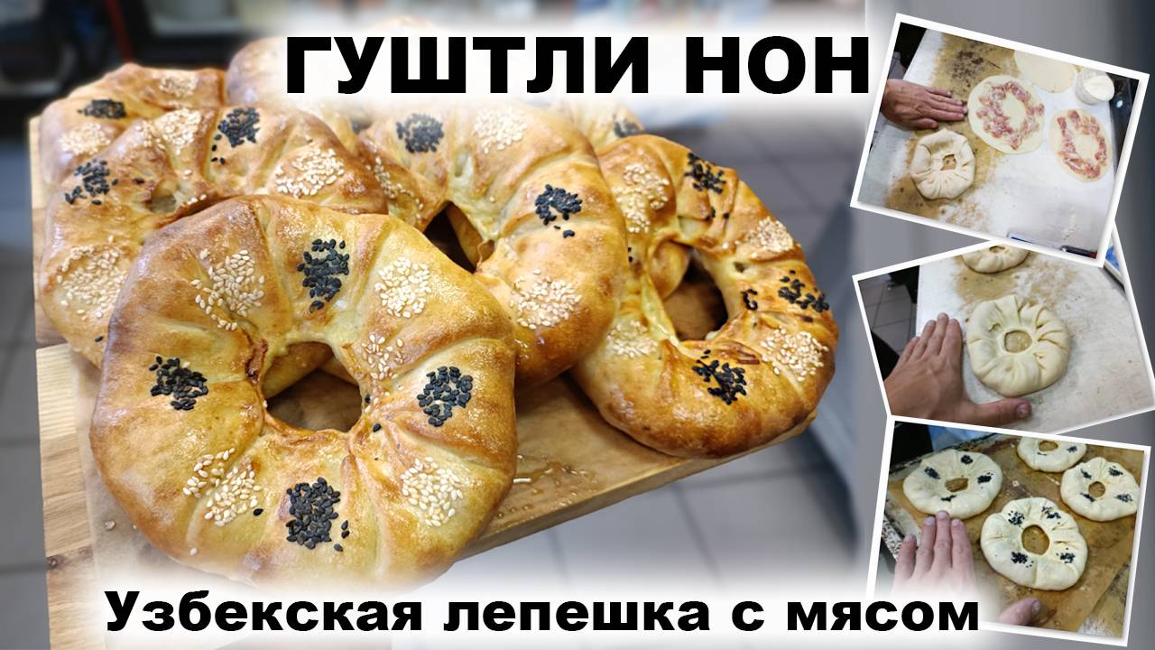 Шеф-Россия.рф скачать: книги, меню, ттк, рецепты, школа, мастер классы. Гуштли нон — это традиционная узбекская лепёшка в форме большого бублика с мясом внутри. Узбекских мясных лепёшек «Гуштли Нон»: Ингредиенты: Для теста: мука — 450 г, вода — 300 мл, дрожжи (свежие) — 10 г, соль — 7 г. Для начинки: мясной фарш — 250 г, репчатый лук (средний) — 1 шт., соль — 1/2 ч. л., зира — 1/3 ч. л., перец чёрный — 1/3 ч. л., сушёный райхон (базилик) — 1 ч. л.. Приготовление: Для теста: развести дрожжи в половине стакана тёплой воды с ложкой муки и оставить на 10 минут. В миску добавить соль, стакан тёплой воды и разведённые дрожжи. Вымесить тесто до гладкости, минут 5–7. Накрыть плёнкой и поставить в тёплое место на 2–3 часа подходить. Для фарша: лук очень мелко нарубить, добавить специи, соль и хорошо вымесить. Формировка: половину теста выложить на припыленный мукой стол, руками размять в лепёшку 25–30 см в диаметре. На лепёшку выложить половину фарша, расплющивая между ладоней в лепёшки и выкладывая на тесто, постепенно заполняя ими всю поверхность. Скатать тестяную лепёшку в рулет и защипать края. Перекрутить рулет так же, как выжимают бельё. Этот манёвр лучше смешивает мясо с тестом. Разрезать тестяной рулет пополам, из него получится 2 лепёшки. Половину рулета поставить на срез и пальцами вдавить верхушку в середину до дна. Переложить заготовку на бумагу для выпечки и костяшками пальцев надавливать на середину, постепенно расширяя её. В серединке тесто должно быть очень тонкое, почти прозрачное. Выложить на лист для расстойки. Проделать то же самое со вторым кусочком рулета и со второй половиной теста и фарша. Разогреть духовку до 200–220 °C. Минут через 15–20 расстойки смазать лепёшки яйцом и посыпать кунжутом. Выпекать 15–20 минут. Для хачапури можно использовать как дрожжевое, так и бездрожжевое тесто. Ниже представлены рецепты двух вариантов. Дрожжевое Ингредиенты: мука — 500 г; молоко — 340 мл; сливочное масло — 80 г; растительное масло — 15 мл; сахар — 15 г; соль — 15 г; свежие дрожжи — 4 г. Приготовление: Немного тёплого молока налить в небольшую миску, добавить соль, сахар, дрожжи и перемешать, оставить постоять на 10 минут. В глубокую ёмкость просеять пшеничную муку. В ёмкость с мукой налить оставшееся тёплое молоко, затем смесь с разведёнными дрожжами, после чего — растопленное сливочное масло (его можно растопить на плите или в микроволновке, а затем охладить до комнатной температуры). Замесить тесто, хорошо месить, пока оно не станет мягким, пышным и послушным. Тесто убрать в глубокую ёмкость, накрыть сверху чистым полотенцем из натуральной ткани, поставить в тёплое место и оставить на 30–40 минут. Видео с рецептом приготовления дрожжевого теста для хачапури: Шеф-Россия.рф Дрожжевое тесто для хачапури.( Грузинский рецепт). Хачапури по -Мегрельски. Бездрожжевое Ингредиенты: кефир — ½ стакана; сметана — ½ стакана; Хачапури по-узбекски Один из рецептов хачапури по-узбекски: Ингредиенты (на 5 порций): тесто — ½ л; сыр — 100 г; петрушка — по вкусу; аджика — для подачи. Рецепт Приготовление: Замесить тесто, добавить соль и дать отдохнуть 10–15 минут, накрыв посуду с тестом влажным полотенцем. Отщипнуть кусочек теста и слегка его раскатать. Сверху натереть сыр на мелкой тёрке так, чтобы начинка была по всему периметру лепёшки, и посыпать петрушкой. Завернуть тесто в виде мешочка и снова раск