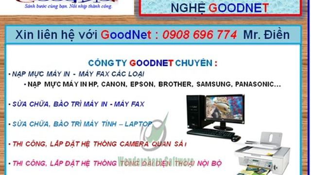 CTY TNHH TM-DV CÔNG NGHỆ GOODNET Call : 0908 696 774 Đ5 : 165/10 Tây Thạnh , Phường Tây Thạnh , Quận Tân Phú , Tp.HCM Đ6 : 20 Lê Quốc Trinh , Phường Phú Thọ Hòa, Quận Tân Phú, Tp.HCM Đ1 : 468/9 Mã Lò , Phường Bình Hưng Hòa A, Quận Bình Tân, Tp. HCM Đ4 : D13/19P Phạm Văn Sáng ,Vĩnh Lộc A , Huyện Bình Chánh , Tp. HCM Đ3 : 101/56 Nguyễn Văn Đậu , Phường 5 , Quận Bình Thạnh , Tp. HCM Đ2 : 47C/107 Huỳnh Tấn Phát, Phường Tân Thuận Đông, Quận 7,Tp.HCM Hotline : 0908 696 774 - 0932 170 970 Mr. Điền Fax : ( 08 ) 54 00 17 16 CTY TM-DV CÔNG NGHỆ GOODNET chúng tôi với Chi Nhánh bao phủ tất cả các Quận trong Thành Phố Hồ Chí Minh và ngoại thành sẽ đem lại dịch vụ nhanh nhất với chất lượng và giá cả tốt nhất. GOODNET với đội ngũ nhân viên kỹ thuật giỏi, giàu kinh nghiệm, nhiệt tình, vui vẻ sẽ làm hài lòng Qúy doanh nghiệp. BẢNG GIÁ DỊCH VỤ Mực in dùng cho máy HP Laser Jet HP Laser jet 3390 - 3392, M2727nf, P2015, P2014n Printer (Series) HP Laser jet 1100 - 1000 - 3200 - 3220 All in one (Series) HP Laser jet P1005 -1006 HP Laser jet P1505 - M1522 - M1122 -1120 HP Laser HP LaserJet Pro P1606dn, P1566, P1560 (Series) HP Laser jet P1102, P1102w, M1212nf (Series) 90.000 Mực in Cannon Laser Canon LBP LBP350, LBP800, LBP810, LBP1120, LBP1110, 3050 Canon Cartridge EP-25 Canon LBP 1210 Canon Cartridge EP-26 Canon LBP3200, LBP3200i, MF3110, MF3222 Canon LBP2900, LBP3000 5 Canon Cartridge FX-9 L120, MF4122, MF4150, MF4680, L140, L160, MF4270, MF4320d, MF4350d 6 FX-3 L200, L220, L240, L280, L295, L250, L350, L360, L300 90.000 Mực in dùng cho máy in Samsung Laser SAMSUNG SCX 4300 - 4725 - 4500 - 4200 - 1640 SAMSUNG ML-1210, M-1510, SAMSUNG ML -1710, 1740, 1750, ML-5100 130.000 Dùng cho máy in Lexmarkl Laser LEXMARK X215, E310, E312, E220, LEXMARK E230, SF 560, 565P, LEXMARK 755P, OPTRA-ST 130.000 Mực in dùng cho máy in Brother Laser BROTHER HL-2140, HL-2170W, HL-5340D BROTHER DCP-7030, DCP-7040 ,7340, 2140 BROTHER MFC 490C, 6490CW, DCP 385C, 5250, MFC 7360 140.000 Dùng cho máy in Panasonic Laser Laser KX-FA76A KXFL-501/502/503/523/551 Laser KX-FA83E KXFL-511/512/513/540/541/542/543/611/612 Laser KX-FA85 KXFLB-852/802/812/882 Laser KX-FA88A KX-FL401 / 402 / 403 / FLC411 / 412 / 413 / KX MB262 / MB772 / KX-FA92A 160.000