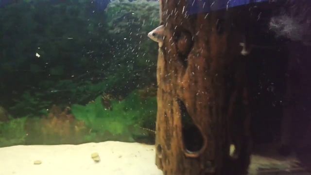 Рыбка при включении света в аквариуме начинает метаться и прячется в укрытие, но попадает в отверстие и никак не может выбраться.