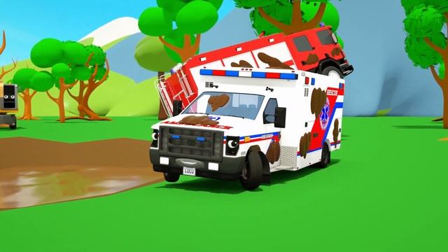 Для малышей! Пожарная машина и скорая помощь застряли в большой луже — детские стишки и песенки