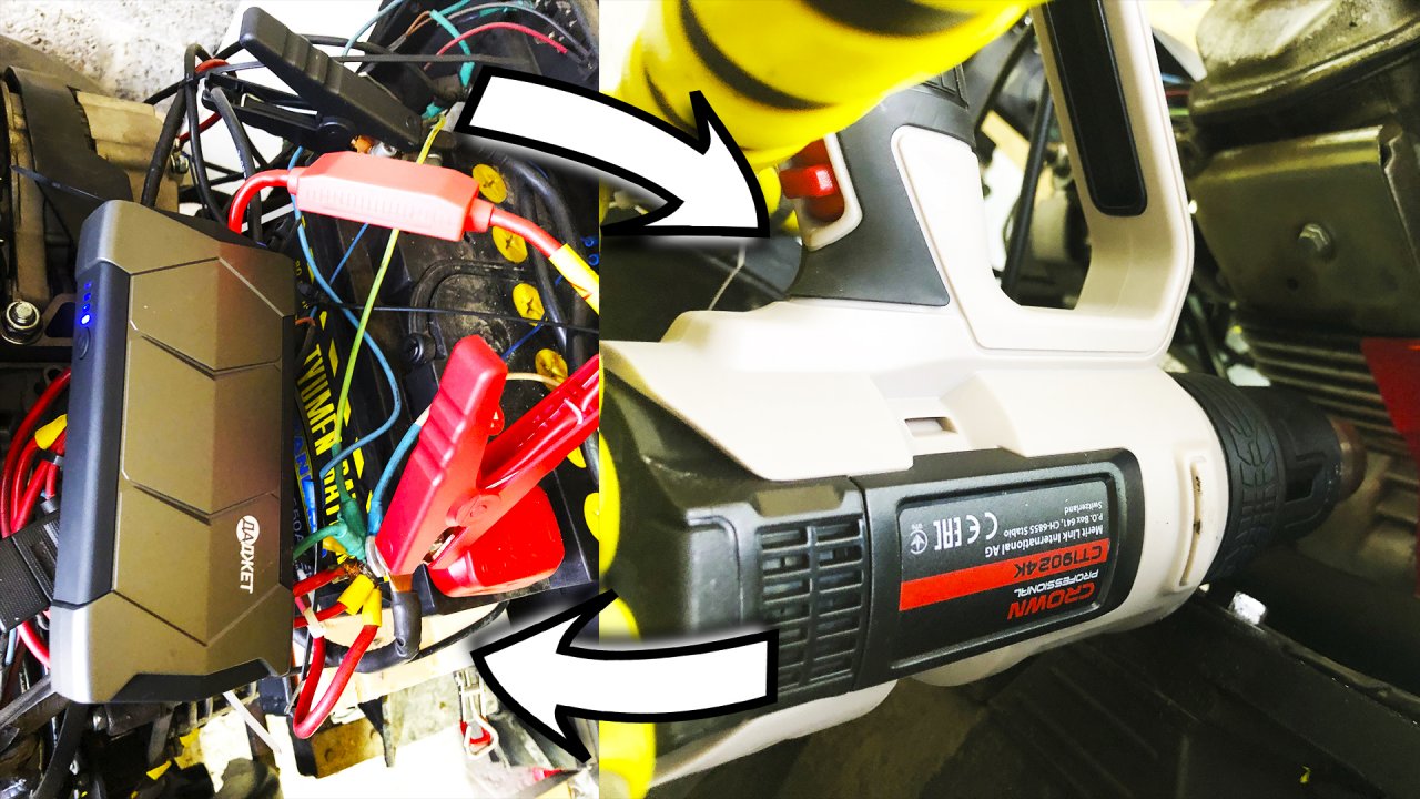 ЗАВОДИМ В -25 мотоблочный двигатель. Строительный фен CROWN и мини пусковой ДАДЖЕТ 8000 мАч в помощь