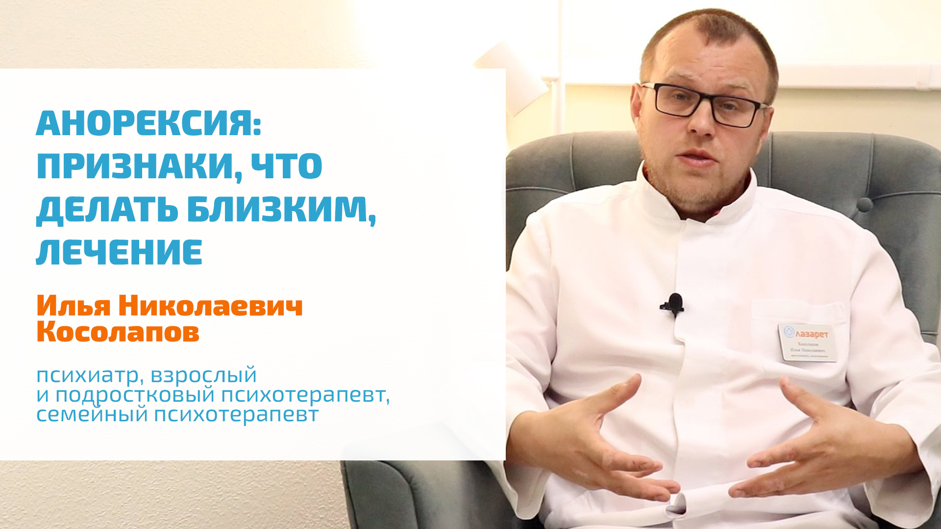 #ПСИХОЛОГИЯ #ПСИХИАТРИЯ #ЗДОРОВЬЕ https://lazaretspb.ru/psihiatriya/ Быстрая потеря веса возможна не только на диете или оздоровительном голодании. Опасное голодание и иррациональные диеты, которые возникают на фоне нервной анорексии, приводят к катастрофическому снижению массы тела, вплоть до госпитализации в реанимационное отделение. Важно понимать, что нервная анорексия — психическое расстройство и такому человеку достаточно сложно контролировать собственное пищевое поведение. Искаженное представление о собственной личности и теле, к сожалению, заставляют таких людей ходить на тонкой нити между жизнью и смертью. Важно знать, что в некоторых случаях последствия истощения являются необратимыми и приводят к неминуемой смерти. 00:00 • Что такое нервная анорексия? 00:00 • Симптомы и признаки нервной анорексии 00:00 • Сколько нужно килокалорий в сутки подростку? 00:00 • Что делать родителям, если ребенок сильно потерял в весе, резко похудел? 00:00 • Про жесткие диеты, голодание 00:00 • Большая и атипичная нервная анорексия 00:00 • Лечение нервной анорексии в психиатрическом стационаре 00:00 • Лечение анорексии без госпитализации 00:00 • Синдром отличные и нервная анорексия 00:00 • Обращение к родителям и близким людей с анорексией Подробнее о лечении нарушений сна, бессонницы (диссомнии), сонливости, ночных кошмаров, рассказывает Илья Николаевич Косолапов — психиатр, врач-психотерапевт, специалист по подбору психофармакотерапии. ? ЗАПИСЬ, КОНСУЛЬТАЦИЯ МЫ РАБОТАЕМ КРУГЛОСУТОЧНО, БЕЗ ВЫХОДНЫХ Если у Вас возникли вопросы о вариантах лечения психических расстройств и зависимостей, наши операторы ответят на них. Звоните — мы работаем круглосуточно, в том числе в выходные и праздничные дни. +7 (812) 604-33-30 8 (800) 300-64-39 ? ГОСПИТАЛИЗАЦИЯ В СТАЦИОНАР ИНОГОРОДНИМ, ЖИТЕЛЯМ БЛИЖНЕГО И ДАЛЬНЕГО ЗАРУБЕЖЬЯ Для иногородних, жителей ближнего и дальнего зарубежья, желающих пройти полноценное лечение в психиатрическом или наркологическом стационаре нашей клиники, возможна консультация по Skype, WhatsApp, Viber, Telegram. Напишите нам на адрес электронный почты, указав в письме контактную информацию, причину обращения, удобное для Вас время звонка. info@lazaretspb.ru ? КЛИНИКА ЛАЗАРЕТ — ОСОЗНАННЫЙ ВЫБОР ПСИХИАТРИЯ, ПСИХОТЕРАПИЯ, НАРКОЛОГИЯ И ПСИХОЛОГИЧЕСКАЯ ПОМОЩЬ Клиника Лазарет — одна из старейших клиник Санкт-Петербурга, специализирующаяся на помощи людям с легкими, пограничными и тяжелыми расстройствами психики, различными зависимостями. Также мы помогаем родственникам пациентов на всех этапах лечения — от мотивации к прохождению полноценного лечения, до ресоциализации — момента возвращения человека в общество и в семью, требующего специализированной психологической помощи и коррекции поведения. https://lazaretspb.ru https://vk.com/klinikalazaret