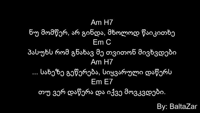 like my facebook page, მოიწონეთ ჩემი ფეისბუქის გვერდი https://www.facebook.com/pages/Baltazar-channel/1422263211351003 oto berishvili - zafxulis erti lamazi dge iyo teqsti + akordebi , teksti , text : Am H7 ზაფხულის ერთი ლამაზი დღე იყო Em C შენ რომ დაგინახე და ღამე გაიყო Am H7 ორად გაიყო დღისგან გამოიყო Em E7 შებინდდა და უცებ გრიგალი დაიწყო Am H7 მე რომ შემიყვარდი სიცივე დაიწყო Em C ლამაზი ღამისგან წყვდიადი წარმოიშვა Am H7 მთვარემ ფერებში ღამე ჩამალა Em E7 და გათენება უკვე გვიან იყო Am H7 ისევ დაგინახე და ტირილი მომინდა Em C ღამისფერ თვალებიდან ცრემლი წამოვიდა Am H7 ლოყაზე ჩამოვიდა ნიკაპს დაეკიდა Em E7 უცებ გაქრა და ნეტავ სად წავიდა Am H7 შენთან წამოვიდა წერილი მოგიტანა. Em C ჩემი სიყვარულის ხელით დაწერილი Am H7 რომ მოვა გეტყვის რომ ვინ გამომატანა Em E7 ნუ გაგიკვირდება მე თუ ვიქნები. Am H7 ნუ მომწერ, არ გინდა, მხოლოდ წაიკითხე Em C პასუხს რომ გნახავ მე თვითონ მივხვდები Am H7 ... სახეზე გეწერება, სიყვარული დაწერს Em E7 თუ ვერ დაწერა და იქვე მოვკვდები. Am H7 ... სახეზე გეწერება, სიყვარული დაწერს Em E7 თუ ვერ დაწერა და იქვე მოვკვდები. Fm E მადლობა ოცნებებს მადლობა ღმერთს Am Dm გეტყვი იმას მე, რასაც არ ვწერ E Am ფიქრებში გართულ მომაკვდავ ერს A ეჭვიანობის სარტყელი კბენს Am H7 ქუჩაში ობლად გამოწვდილ ხელს, Em C ნუ დამანახებ გაგიმხელ ბევრს, Am H7 უსამართლობას ნუ მაზიარებ Em E სხეულს დავუტოვებ მე მკვეთრ იარებს Fm E დიდ სიყვარულზე ნუღარ მოყვები Am Dm ვიცი, კარს იქით სულ სხვას მიყვები E Am გზა და გზა ფიქრით უკან ბრუნდები A ვაი თუ დაგრჩა სხვისი მუზები Am H7 მადლობას ვუხდი შეცდომებს ძველს Em C ვერ გაპატიებ და თავს ვერ ვდებ Am H7 ასე მოწყენა თუ შეეძლო მზეს Em E თვით მთვარეც დათმობდა ოცნებებს ბნელს Fm E არ გეტყვი მე თუ გავიფიქრებ ბევრს Am Dm ადიდებული მთაწმინდის გზებს E Am სულ მარტო ხოხიალით ავივლი A თუ ეს უშველის დამწვარ მზეს Am H7 მერე შევქმნი მე სამყაროს ჩემს Em C სადაც დავხატავ მწვანეე გზებს Am H7 მადლობა ოცნებებს მადლობა ღმერთს Em C იქ მაინც ვიტყვი რაც ვერ ვთქვი დღეს!