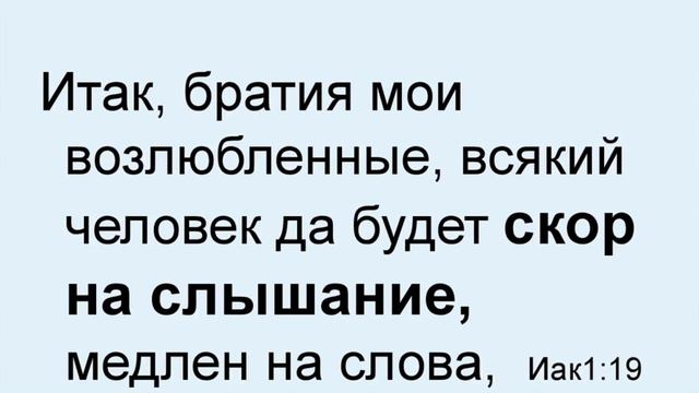 Евангелие от Луки 8 глава– 18 Итак, наблюдайте, как вы слушаете: ибо, кто имеет, тому дано будет, а кто не имеет, у того отнимется и то, что он думает иметь. Послание Иакова 1 глава– 19 Итак, братия мои возлюбленные, всякий человек да будет скор на слышание, медлен на слова, медлен на гнев, 20 ибо гнев человека не творит правды Божией. 21 Посему, отложив всякую нечистоту и остаток злобы, в кротости примите насаждаемое слово, могущее спасти ваши души. 22 Будьте же исполнители слова, а не слышатели только, обманывающие самих себя. 23 Ибо, кто слушает слово и не исполняет, тот подобен человеку, рассматривающему природные черты лица своего в зеркале: 24 он посмотрел на себя, отошел и тотчас забыл, каков он. 25 Но кто вникнет в закон совершенный, закон свободы, и пребудет в нем, тот, будучи не слушателем забывчивым, но исполнителем дела, блажен будет в своем действии.