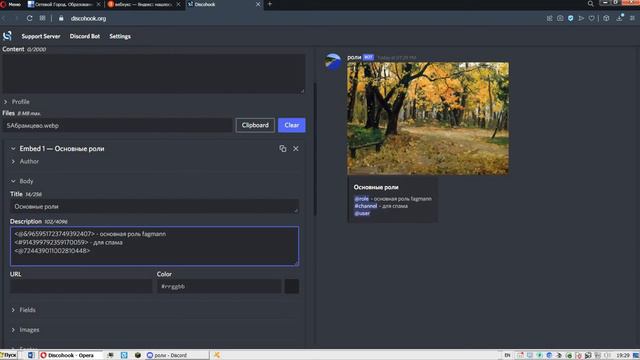 Ссылка на дс сервер- https://discord.gg/rzJccD4SB4 Мой ник - FagMann#2604 Ссылка на дискхукс - https://discohook.org