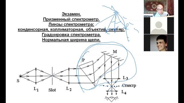 14 лекция, часть 2, Оптика, СПбГУ, 2021, Крылов И. Р. Линзы спектрометра: конденсорная, коллиматорная, объектив, окуляр (окончание). Нормальная ширина щели. Градуировка спектрометра. Хроматическая аберрация.