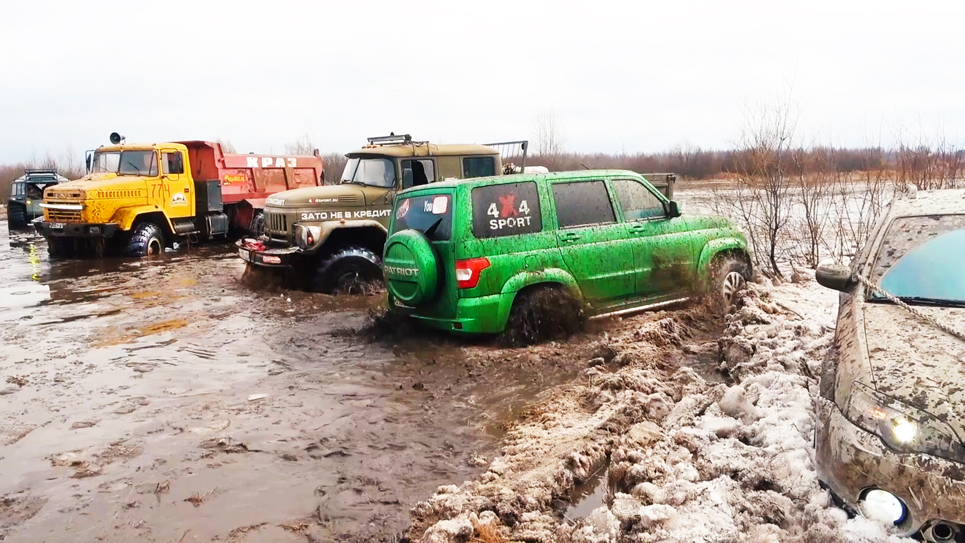 Грузовики и мажоры спасаются из половодья. КРАЗ, ГАЗ 66, ЗИЛ 131, Митсубиши, Нива, УАЗ на бездорожье