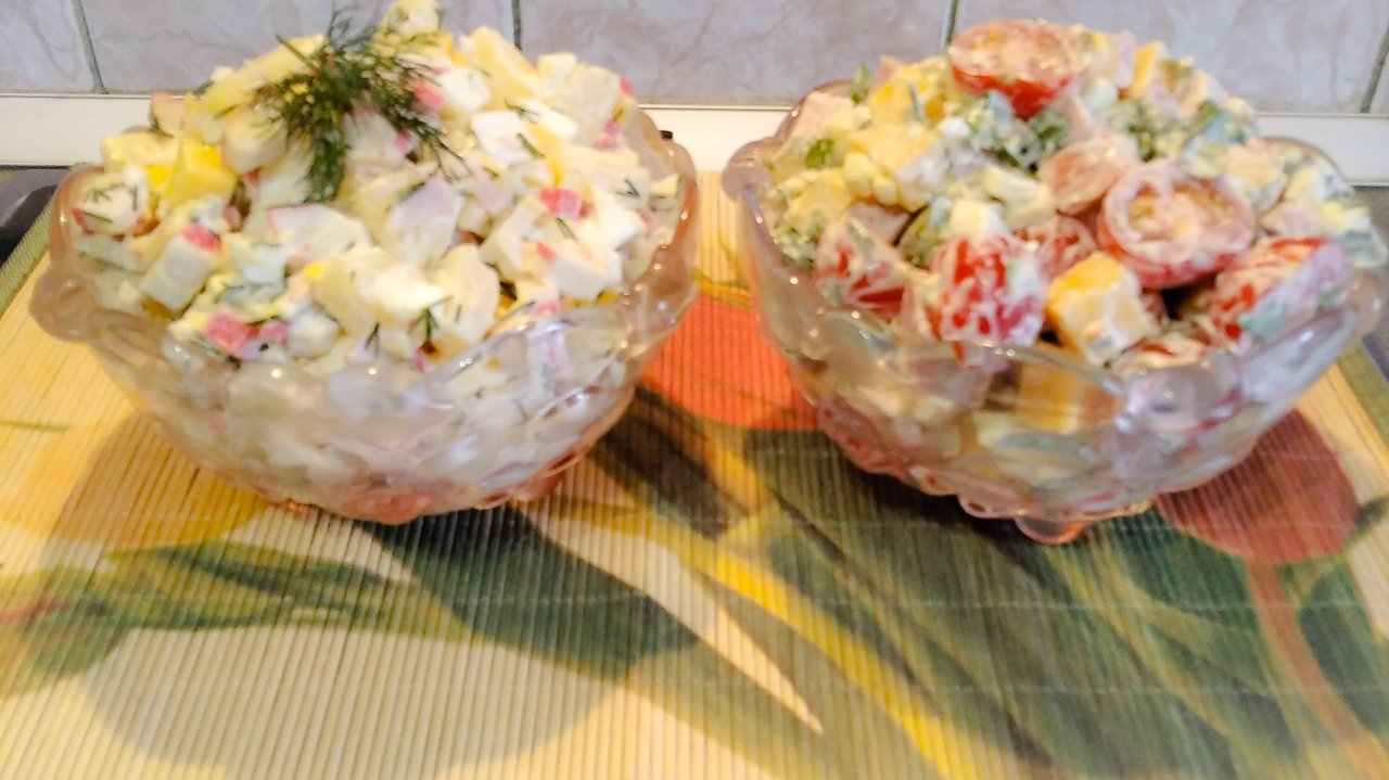 Два салата на праздничный стол: один с крабовыми палочками, а второй с ветчиной