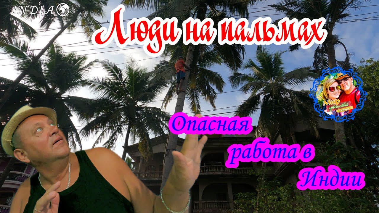 Южное ГоаОпасная работа в Индии. Люди на пальмах. Снятие кокосов.