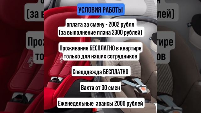 РАБОТА В ГОРОДЕ РЯЗАНЬ! Вахта! Обязанности: Работа БЕЗ навыков! 1. Готовое Пластиковое сиденье обрезать по форме. 2. Зачистить автоматической пилочкой от заусенцев (не вручную, а все автоматизировано) 3. Шуроповертом прикрутить спинку к сиденью 4. Надеть на пластиковое изделие чехол с поролоном. 5. Сложить готовое изделие в коробку. Это все делают разные люди! И мужчины, и женщины. Это 5 операций на данном производстве. ОТДЕЛ КАДРОВ ?????? ☎️ 89197667586 (WhatsApp, Viber) http://wa.me/79197667586 ☎️ 89771289232 (WhatsApp, Viber) http://wa.me/79771289232 Наш телеграмм: https://t.me/vahta_ok Страничка ВК: https://vk.com/rabota_vahta_absolut Страничка в ОК: https://ok.ru/profile/579701607021?utm_campaign=ios_share&utm_content=