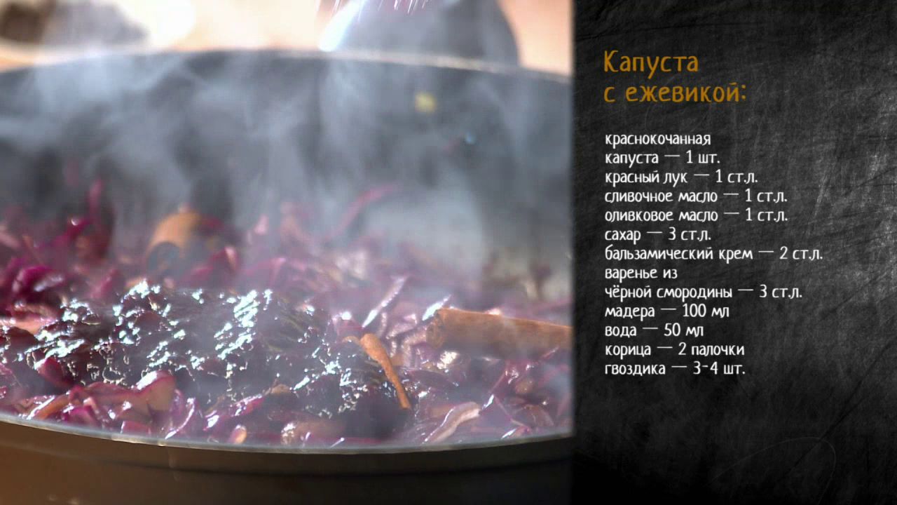 Ингредиенты: Краснокочанная капуста — 1 шт. Красный лук — 1 ст.л. Сливочное масло — 1 ст.л. Оливковое масло — 1 ст.л. Сахар — 3 ст.л. Бальзамический крем — 2 ст.л. Варенье из черной смородины — 3 ст.л. Мадера — 100 мл Вода — 50 мл Корица — 2 палочки Гвоздика — 3-4 шт. Приготовление: Тонко нашинкуйте краснокочанную капусту, красный лук порежьте полукольцами. Тщательно перемешайте и добавьте корицу, гвоздику, пару ложек варенья из черной смородины, черный молотый перец и соль. Полейте небольшим количеством воды и мадеры? Оставьте томиться на медленном огне 40 минут. Почти готовую капусту засыпьте ежевикой и тушите еще 5-7 минут.