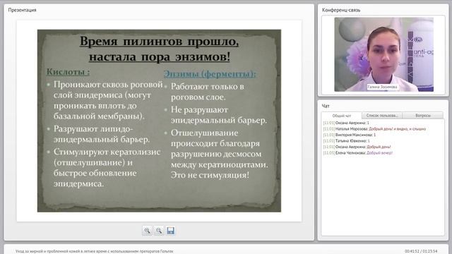 Вебинар посвящен вопросам ухода за проблемной кожей с применением косметических средств Гельтек. В рамках вебинара рассмотрим причины обострения акне в летний период: солнце, загрязнения, потеря кожей влаги, жара. Поговорим о правильной защите от ультрафиолета, об антиоксидантах, о том, как уменьшить жирность кожи, не повредив защитный барьер. Расскажем о круглогодичных пилингах на основе энзимов. Обсудим формы акне: комедональную, папуло-пустулёзную, узловую, и расскажем, как ухаживать дома за жирной, комбинированной и проблемной кожей.