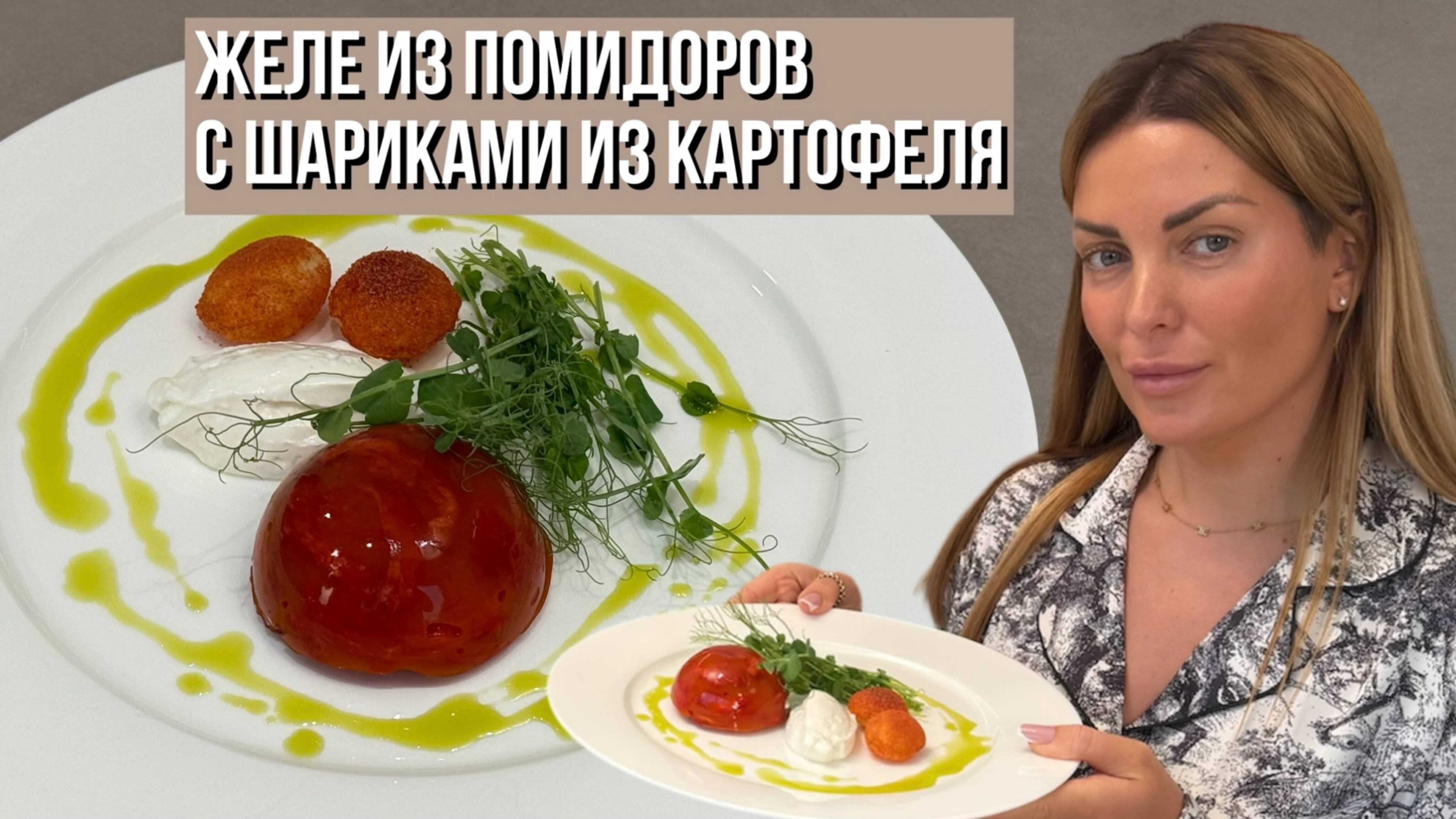 Ингредиенты: Для желе: • помидоры, 3 кг • соль • чеснок, 2 зубчика • 1 лук шалот • тимьян • желатин, 2 листа • агар-агар, 2 г Для зеленого масла: • листья инжира, 30 г • подсолнечное масло, 150 г Для картофельных подушечек: • картофель, 1 шт • крахмал • 1 яичный белок • томатная пыльца Для майонеза из маскарпоне: • яичный белок, 40 г • маскарпоне, 50 г • рисовый уксус, 25 г • соль • подсолнечное масло, 130 г • лимонная цедра Готовим: 1 Сначала надрежьте помидоры тонкими крестообразными полосками с обеих сторон и бланшируйте их в кипящей воде в течение 20 секунд. Затем сразу же остудите в ледяной воде. 2 Когда помидоры остынут, снимите с них кожицу (она нам еще пригодится). Затем разрежьте помидоры на четыре части и удалите семена (также оставьте их на потом). 3 Очищенные дольки помидоров выложите на противень и посолите. Отправляем помидоры в духовку, чтобы они подсушились раза в 2 (они сушились у меня 3 часа на режиме «конвекция» + я немного приоткрыла дверцу духовки ~2 см, чтобы лучше выходила влага), но ориентируйтесь на свою духовку. После переложите все дольки в большую миску. 4 Кожицу от помидоров подсушите в духовке при 50°С до хрустящей корочки. Затем измельчите кожуру в мелкую крошку. 5 Сердцевину от помидоров взбейте в блендере до однородности, после процедите всю жидкость через сито и перелейте в сотейник и уварите до 300 грамм, после в теплую смесь добавьте агар-агар и прокипятите 1–2 минуты, а после добавьте заранее замоченный желатин. После залейте этой смесью дольки в миске, перемешайте и переложите все в силиконовые формы, пока смесь не схватилась (это надо делать быстро), и уберите в холодильник. 6 Готовим зеленое масло. В чаше для блендера залейте листья инжира подсолнечным маслом и взбивайте до однородности, пока масло не нагреется до 65°С. Я взбивала в блендере Bork на режиме «Суп», так как там есть подогрев, а это важно, чтобы масло потемнело. После процедите масло через сито. 7 Для майонеза из маскарпоне смешайте все ингредиенты в блендере и взбейте до однородной массы. После поставьте майонез в холодильник минимум на 30 минут. 8 Готовим картофельные шарики. Картофель нарежьте тонкими слайсами (~0,5 мм) и после разложите на доске в два ряда, высушив их перед этим. 9 Один ряд покройте тонким слоем крахмала с помощью кисточки, а второй ряд взбитым яичным белком. После положите один слайс на другой (сторону с крахмалом к стороне с белком), но не прижимайте, и с помощью кондитерского кольца вырежьте кружки. Затем обжарьте их во фритюре при 170°С до золотистой корочки. 10 После каждый картофельный шарик обваляйте в томатной пыльце. 11 Собираем блюдо. На тарелку выложите желе, рядом крем-майонез из маскарпоне с картофельными шариками, украсьте микрозеленью и полейте зеленым маслом. Приятного аппетита!
