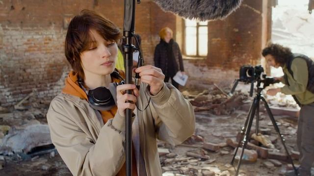 Женщина-производственник настраивает микрофон для записи. #shorts