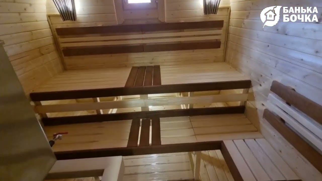 Дизайн парной в бане-бочке (Подсветка пологов, вставки из обожженной осины, абажуры, подспинники)