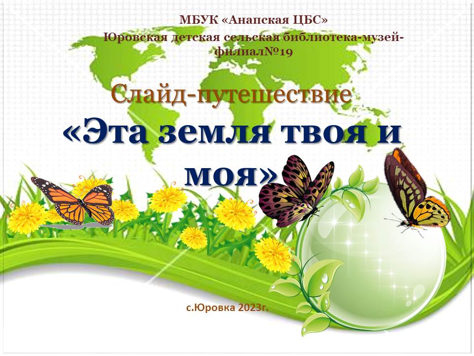 В апреле наша планета Земля празднует свой день. Юровской детской сельской библиотекой-музеем-филиалом №19 подготовлено слайд-путешествие «Эта земля твоя и моя», посвященное этой дате. Мы приглашаем отправиться в экологическое путешествие по планете - Земля. Надеемся, что оно доставит Вам много прекрасных мгновений, радости, любви, тепла, умиротворения. Поможет нам с вами ещё раз задуматься о нашем общем доме и о том, что этот дом надо любить, беречь и преумножать его богатства. Подготовлено главным библиотекарем Юровской детской сельской библиотеки-музея-филиала №19 И.А. Матюшовой