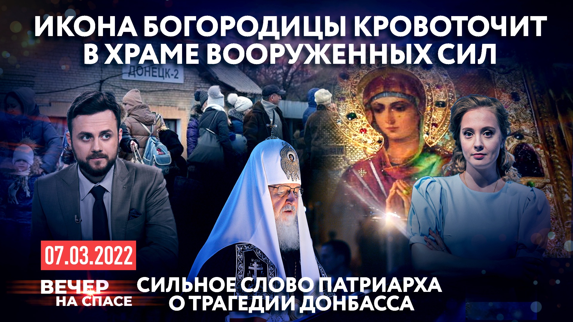 ⚡️В выпуске 07.03.22: ? Весна духовная. Верующие вступили в Великий пост, а в храмах началось чтение покаянного канона Андрея Критского. ? Патриарх Кирилл призвал каждый день молить Бога о прощении грехов, в Белоруссии проходит третий раунд переговоров между российской и украинской делегациями, в Белграде прошел многотысячный митинг в поддержку России. Расскажем о главных событиях этого дня. ? «И сказал Бог: да будет свет». Прочтем и разберём Писание дня с отцом Дмитрием Селивановским. ? Как Церковь помогает беженцам. Прямое включение нашего корреспондента Екатерины Филимоновой из Ростова-на-Дону и люди, спасшиеся от бомбёжек, в нашей студии. ? Дорога памяти. Тысяча четыреста восемнадцать шагов к Победе. Очередной выпуск нашей специальной рубрики о подвиге народа-победителя. ?Таймкоды: 0:00 Вступление и анонс главных тем. 1:30 Главные новости. 30:00 Писание дня. 34:30 Главные новости. 42:59 Святой дня. 47:43 1418 шагов до победы. 54:49 ТОК-ШОУ Донбасс. Беженцы. В гостях: ВИТА ИВАНОВНА ШЕЛИЯ ТАТЬЯНА НИКОЛАЕВНА КУЗНЕЦОВА ГЛЕБ КУЗНЕЦОВ ЛИНА ВАСИЛЬЕВНА ЗИНЧЕНКО-ЖИЛЯЕВА АЛЕКСАНДРА ИВАНОВНА ПАНЧЕНКО ТАТЬЯНА ВАСИЛЬЕВНА ТРЕТЬЯКОВА - семейный психолог 1:20:25 ТОК-ШОУ Великий Пост. В гостях: ПРОТОИЕРЕЙ ВАСИЛИЙ ГЕЛЕВАН - клирик храма Благовещения Богородицы в Сокольниках ПРОТОИЕРЕЙ АЛЕКСЕЙ БАТАНОГОВ - настоятель храма святого равноапостольного великого князя Владимира в Новогиреево ИЯ БАТАНОГОВА ИЕРОМОНАХ СЕРГИЙ (ФИЛИППОВ) - и.о. настоятеля подворья Новоспасского монастыря в с. Сумароково) СЕРГЕЙ КОМАРОВ - публицист 1:44:50 Писание дня. 1:55:00 Апокалипсис. 2:00:35 Апокалипсис вслух. ЭТО ВЕЧЕР НА СПАСЕ. ГЛАВНОЕ НА СЕГОДНЯ И… ВСЕГДА.