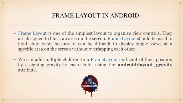 In android, Framelayout is a ViewGroup subclass that is used to specify the position of View instances it contains on the top of each other to display only single View inside the FrameLayout. In simple manner, we can say FrameLayout is designed to block out an area on the screen to display a single item. The pictorial representation of frame layout in android applications is explained in this video. In android, FrameLayout will act as a placeholder on the screen and it is used to hold a single child view. In FrameLayout, the child views are added in a stack and the most recently added child will show on the top. We can add multiple children views to FrameLayout and control their position by using gravity attributes in FrameLayout. #CodeCarnation #AndroidStudio #AndroidProject #AndroidApplications