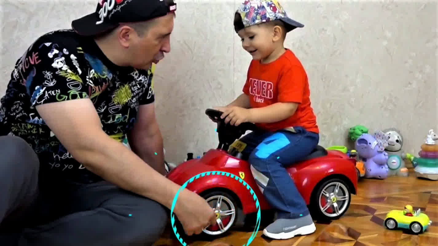 Трофимка и папа весело играют вместе! Катают машинки, а потом Трофимка заправляет большие машины и мотоцикл топливом, а папа в роли заправщика.