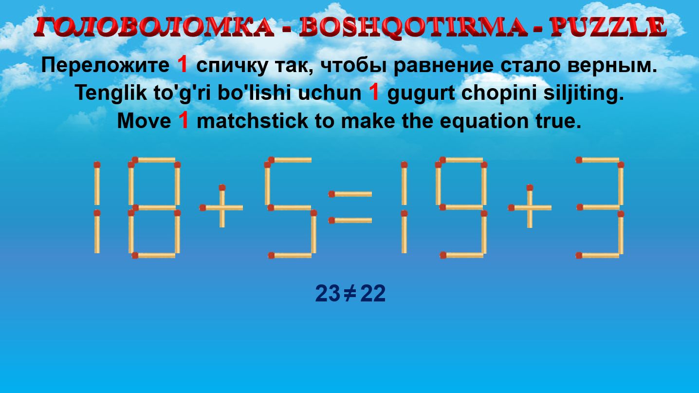 ГОЛОВОЛОМКА - BOSHQOTIRMA – PUZZLE. Спичка. 18+5=19+3, 13+9=15+8, 15+9=13+9, 14+9=18+3