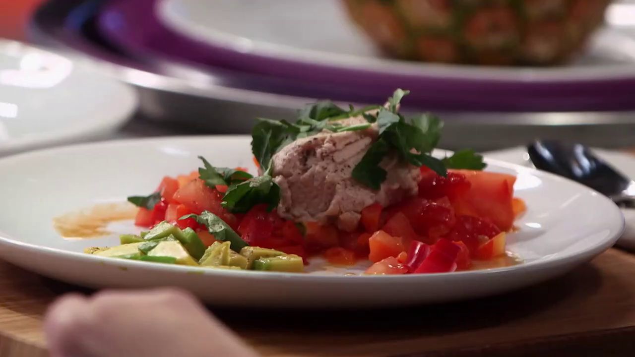 Участники команды «Хачапурчики» соединили в своём салате малосочетаемые ингредиенты: печень трески и помидоры. К этой основе они добавили жареный перец и мелко нарезанный авокадо. Посмотрим, как отреагируют судьи на такое необычное соединение продуктов.