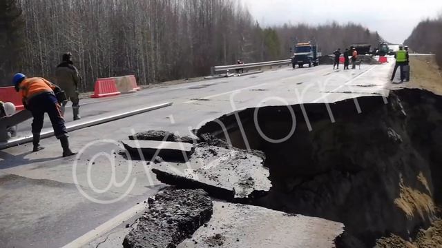 Снег растаял вместе с асфальтом. Рабочие восстанавливают размытый участок автодороги Нефтеюганск - Пыть-Ях.