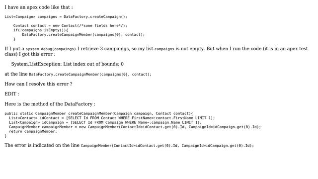 Salesforce: System.ListException: List index out of bounds: 0 when list is not empty Helpful? Please support me on Patreon: https://www.patreon.com/roelvandepaar With thanks & praise to God, and with thanks to the many people who have made this project possible! | Content (except music & images) licensed under CC BY-SA https://meta.stackexchange.com/help/licensing | Music: https://www.bensound.com/licensing | Images: https://stocksnap.io/license & others | With thanks to user Oleksandr Berehovskyi (salesforce.stackexchange.com/users/22425), user dou (salesforce.stackexchange.com/users/22375), and the Stack Exchange Network (salesforce.stackexchange.com/questions/233051). Trademarks are property of their respective owners. Disclaimer: All information is provided "AS IS" without warranty of any kind. You are responsible for your own actions. Please contact me if anything is amiss at Roel D.OT VandePaar A.T gmail.com
