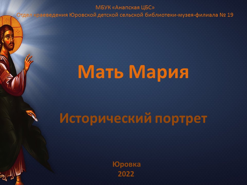 У каждого из нас в голове живут свои образы. Кто-то при слове «монахиня» представляет толстую добрую тётеньку с улыбкой, кто-то — изможденную сухую суровую старуху. Термин «поэтесса Серебряного века» вызывает в памяти Ахматову, дым «Бродячей собаки», холодный Петербург. И, кажется, что нет никакой силы, способной все эти возникающие истории примирить и свести в одной точке. Однако сила такая есть, и у нее есть конкретное имя. Точнее даже несколько имен: мать Мария (Скобцова). Она же Елизавета Кузьмина-Караваева, она же Лиза Пиленко. Она же святая Константинопольской церкви преподобномученица Мария. Практически современная нам святая. Целая вселенная. Сегодня Елизавете Юрьевне Скобцовой (урожденной Пиленко) исполнился бы 131 год. О биографии матери Марии можно сказать, что она пережила самые адские для России события: обе революции, две мировые войны, гражданскую войну, изгнание и жизнь в эмиграции. Отдел краеведения Юровской детской сельской библиотеки-музея предлагает исторический портрет «Мать Мария». Составитель: Заведующий отделом краеведения Юровской детской сельской библиотеки-музея, филиала №19 «МБУК «Анапская ЦБС» Димитрашко И.В.