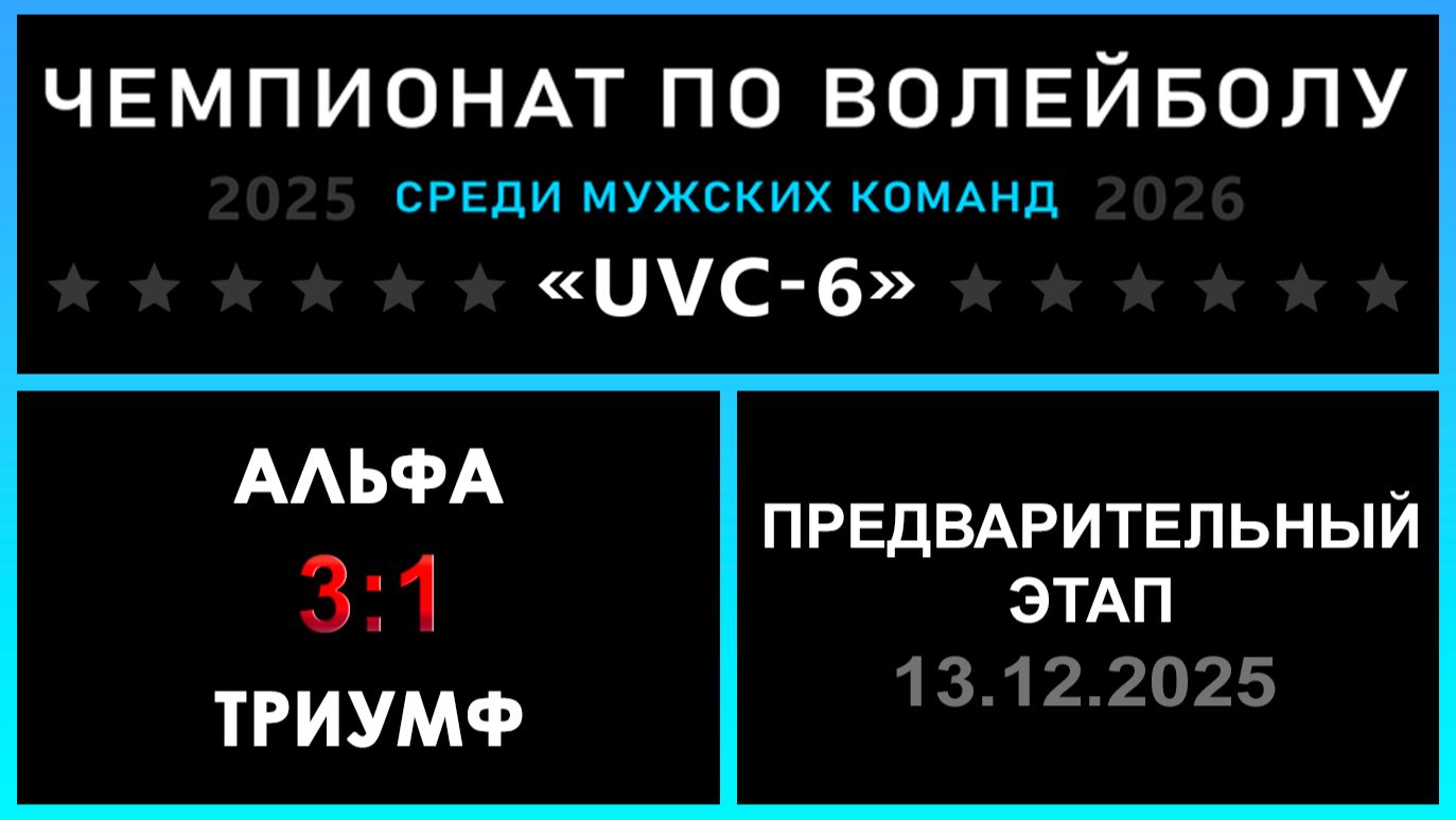 UVC-6 (Мужчины): Чемпионат UVC Лиги по волейболу среди мужских команд 2025-2026 гг. Результаты игры: Предварительный этап 13.12.2025 Альфа - ТРИУМФ 3:1 (28:26, 19:25, 25:21, 25:18) Альфа распечатала графу побед на финише Предварительного этапа! ТРИУМФ сегодня проиграл, но смотрелся достойно! Теперь командам предстоит проверить свои силы на Групповым этапе LEVEL ONE! «РЕШАЛЫ» - конкурс для команд : ✅ Альфа идет дальше! «Nostradamus trophy» - конкурс для участников группы ВКонтакте: ✅ 28 - количество участников, которые смогли предсказать точный исход матча! #UVC_ЛИГА_ЧЕМПИОНАТ_UVC_6_Мужчины