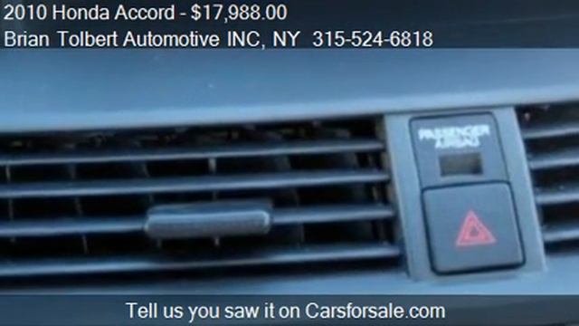 Brian Tolbert Automotive INC 930 State Route 104 in Ontario, NY 14519 Come test drive this 2010 Honda Accord EX-L Sedan AT for sale in Ontario, NY. http://www.btauto.com #1 Rated!! ONLY 35k Miles!! Top Of The Line EX-L, One Owner Prior Lease Vehicle Purchase From Honda Motor Of America,Honda Factory Power Train Warranty Until 60,000 Miles, Heated Power Leather Seats, , ABS, Stability Control, Side Curtain Airbags, Factory Moon Roof, Factory Alloy Wheels, HiPower CD Changer With Satellite Stereo, Rated 21/31 MPG, Non Smoker, Compare and Save!!!! Call 315-524-6818 TODAY!!!! See All Of Our Inventory At BTAUTO.COM Option List:ABS Brakes,Air Conditioning,Alloy Wheels,AM/FM Radio,Anti-Brake System: 4-Wheel ABS,Automatic Headlights,Body Style: SEDAN 4-DR,Cargo Volume: 14.00 cu.ft.,CD Changer,CD Player,Child Safety Door Locks,Cruise Control,Curb Weight-automatic: 3433 lbs,Daytime Running Lights,Driver Airbag,Driver Multi-Adjustable Power Seat,Electrochromic Interior Rearview Mirror,Electronic Brake Assistance,Engine Type: 2.4L L4 DOHC 16V,Front Air Dam,Front Brake Type: Disc,Front Headroom: 39.00 in.,Front Heated Seat,Front Hip Room: 56.60 in.,Front Legroom: 42.50 in.,Front Power Lumbar Support,Front Shoulder Room: 58.20 in.,Front Side Airbag,Front Spring Type: Coil,Front Suspension: Ind,Fuel Economy-city: 21 miles/gallon,Fuel Economy-highway: 31 miles/gallon,Heated Exterior Mirror,Interval Wipers,Keyless Entry,Leather Seat,Leather Steering Wheel,Manual Sunroof,Overall Height: 58.10 in.,Overall Length: 194.10 in.,Overall Width: 72.70 in.,Passenger Airbag,Passenger Volume: 101.00 cu.ft.,Power Adjustable Exterior Mirror,Power Door Locks,Power Sunroof,Power Windows,Rear Brake Type: Disc,Rear Headroom: 37.20 in.,Rear Hip Room: 54.30 in.,Rear Legroom: 37.20 in.,Rear Shoulder Room: 56.40 in.,Rear Spring Type: Coil,Rear Suspension: Ind,Rear Window Defogger,Second Row Folding Seat,Separate Driver/Front Passenger Climate Controls,Side Head Curtain Airbag,Standard Seating: 5,Steering Type: RandP,Steering Wheel Mounted Controls,Subwoofer,Tachometer,Tank: 18.50 gallon,Telescopic Steering Column,Tilt Steering,Tilt Steering Column,Tire Pressure Monitor,Tires: 225/50R17,Track Front: 62.20 in.,Track Rear: 62.20 in.,Traction Control,Trunk Anti-Trap Device,Turning Diameter: 37.70 in.,Vehicle Anti-Theft,Vehicle Stability Control System,Wheelbase: 110.20 in.,4 Door,Alarm,Antilock Brakes,Anti-theft,Auto-dim isrv mirror,Automatic Headlight,Automatic Transmission,Automatic w/overdrive Transmission,Bucket Seats,Center Console,Child Seat,Driver Air Bag,Dual Climate Control,Folding Rear Seat,Front Wheel Drive,Heated Seats,Information Center,IPod Port,IPod/MP3 Port,Leather Seats,Lumbar Support,Passenger Air Bag,Power Lumbar Support,Power Seats,Power Steering,Premium Wheels,Rear Air Bags,Rear Defrost,Satellite Radio,Side Air Bags,Splash guards,Steering Wheel Controls,Sun/Moon Roof,Tinted Windows,Tire Pressure Monitoring System,Trip/Mileage Computer Provided by Carsforsale.com http://video.carsforsale.com/vehiclevideo.aspx?vid=185806509
