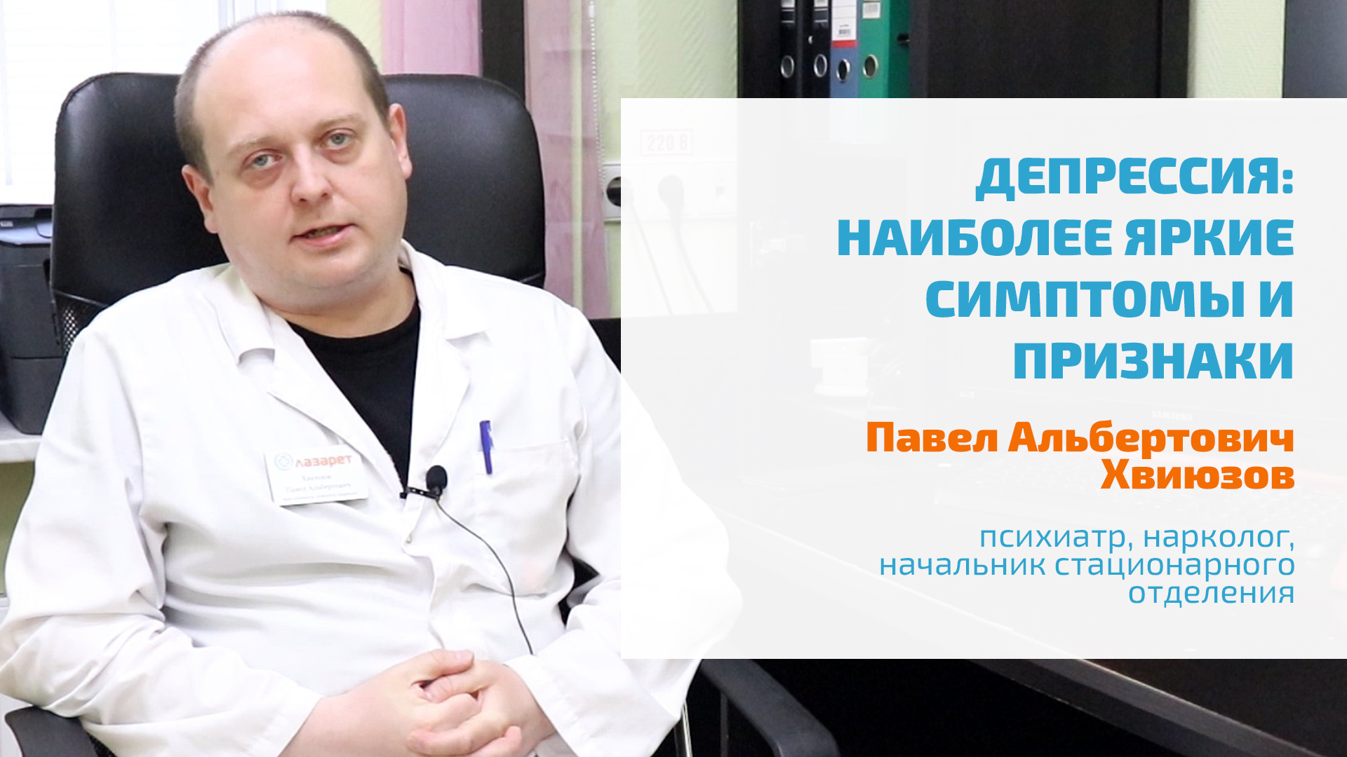 #ДЕПРЕССИЯ #ПСИХИАТРИЯ #ПСИХОЛОГИЯ https://lazaretspb.ru/about-the-clinic/ Депрессия не является только лишь сниженным настроением. Заболевание характеризуется ухудшение мышления, внимания и реакций. Иными словами, симптомы и признаки депрессии распространяются гораздо шире, чем просто ухудшение настроения и нежелание что-либо делать. Помимо этого, депрессия может быть следствием развития уже имеющегося психического (например, при шизофрении, бредовом расстройстве, деперсонализации-дереализации, расстройствах пищевого поведения) или соматического расстройства. В любом случае, для лечения депрессии необходим подбор антидепрессантов в условиях стационара. 00:00 • Депрессия 00:15 • Главные симптомы депрессии 02:03 • Депрессия как следствие психического расстройства 03:09 • Скрытая депрессия 04:35 • Признаки скрытой депрессии О главных симптомах и признаках депрессии рассказывает Павел Альбертович Хвиюзов, психиатр, нарколог, начальник стационарного отделения. ? ЗАПИСЬ, КОНСУЛЬТАЦИЯ МЫ РАБОТАЕМ КРУГЛОСУТОЧНО, БЕЗ ВЫХОДНЫХ Если у Вас возникли вопросы о вариантах лечения психических расстройств и зависимостей, наши операторы ответят на них. Звоните — мы работаем круглосуточно, в том числе в выходные и праздничные дни. +7 (812) 604-33-30 8 (800) 300-64-39 ? ГОСПИТАЛИЗАЦИЯ В СТАЦИОНАР ИНОГОРОДНИМ, ЖИТЕЛЯМ БЛИЖНЕГО И ДАЛЬНЕГО ЗАРУБЕЖЬЯ Для иногородних, жителей ближнего и дальнего зарубежья, желающих пройти полноценное лечение в психиатрическом или наркологическом стационаре нашей клиники, возможна консультация по Skype, WhatsApp, Viber, Telegram. Напишите нам на адрес электронный почты, указав в письме контактную информацию, причину обращения, удобное для Вас время звонка. info@lazaretspb.ru ? КЛИНИКА ЛАЗАРЕТ — ОСОЗНАННЫЙ ВЫБОР ПСИХИАТРИЯ, ПСИХОТЕРАПИЯ, НАРКОЛОГИЯ И ПСИХОЛОГИЧЕСКАЯ ПОМОЩЬ Клиника Лазарет — одна из старейших клиник Санкт-Петербурга, специализирующаяся на помощи людям с легкими, пограничными и тяжелыми расстройствами психики, различными зависимостями. Также мы помогаем родственникам пациентов на всех этапах лечения — от мотивации к прохождению полноценного лечения, до ресоциализации — момента возвращения человека в общество и в семью, требующего специализированной психологической помощи и коррекции поведения. https://lazaretspb.ru https://vk.com/klinikalazaret