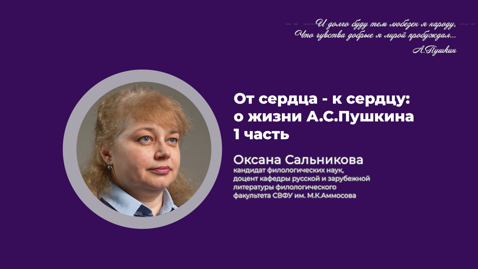 📜🖋️Представляем вашему вниманию цикл видеолекций филологического факультета СВФУ «Следовать за мыслями великого человека есть наука самая занимательная», посвящённых 225-летию Александра Сергеевича Пушкина. 🗣️Начинает сезон Сальникова Оксана Михайловна, кандидат филологических наук, доцент кафедры русской и зарубежной литературы филологического факультета СВФУ имени М.К.Аммосова с темой «От сердца - к сердцу: о жизни А.С. Пушкина». Подписывайтесь на канал и смотрите лекции профессоров СВФУ в один клик! «Наш университет_лекции». 1 сезон: https://goo.gl/EzWwyD «Наш университет_лекции». 2 сезон: https://goo.gl/Ai4mjd «Наш университет_лекции». 3 сезон: https://goo-gl.su/83Ko2RzR «Наш университет_лекции». 4 сезон: https://goo-gl.su/FCEP «Наш университет_лекции». 5 сезон: https://goo-gl.ru.com/u7j «Наш университет_лекции». 6 сезон: https://goo.su/wVXvG «Наш университет_лекции». 7 сезон: https://goo.su/1Hpk0C «Наш университет_лекции». 8 сезон: https://www.youtube.com/watch?v=t4f8HO2QbjA&list=PLfoza8oH6bxOO9mi-_ZUpXQ7S8AOVUlye&pp=gAQBiAQB «Наш университет_лекции». 9 сезон: https://home.strannik-j.org/video/0e1c46e115d2d82067f4bbba73209b6e/?r=wd ➡️ Сайт СВФУ: http://s-vfu.ru ➡️ Сайт «Наш университет_онлайн»: http://nusvfu.ru/ ➡️ Подкаст «Сырдат»: Яндекс.Музыка: https://music.yandex.ru/album/13451110