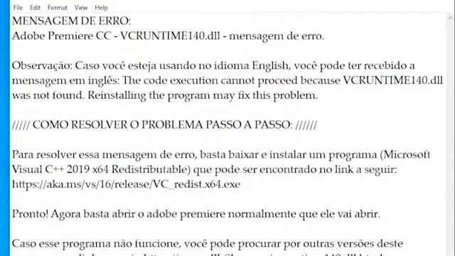MENSAGEM DE ERRO: Adobe Premiere CC - VCRUNTIME140.dll - mensagem de erro. Observação: Caso você esteja usando no idioma English, você pode ter recebido a mensagem em inglês: The code execution cannot proceed because VCRUNTIME140.dll was not found. Reinstalling the program may fix this problem. ///// COMO RESOLVER O PROBLEMA PASSO A PASSO: ////// Para resolver essa mensagem de erro, basta baixar e instalar um programa (Microsoft Visual C++ 2019 x64 Redistributable) que pode ser encontrado no link a seguir: https://aka.ms/vs/16/release/VC_redist.x64.exe Pronto! Agora basta abrir o adobe premiere normalmente que ele vai abrir. Caso esse programa não funcione, você pode procurar por outras versões deste programa no link a seguir: https://www.dll-files.com/vcruntime140.dll.html *** INFORMAÇÕES DO PC UTILIZADO NESSE VIDEO: WINDOWS 10 PRO VERSION 1903 2019 X64 EN-US 4GB RAM I3-7100 CPU 3.30GHz