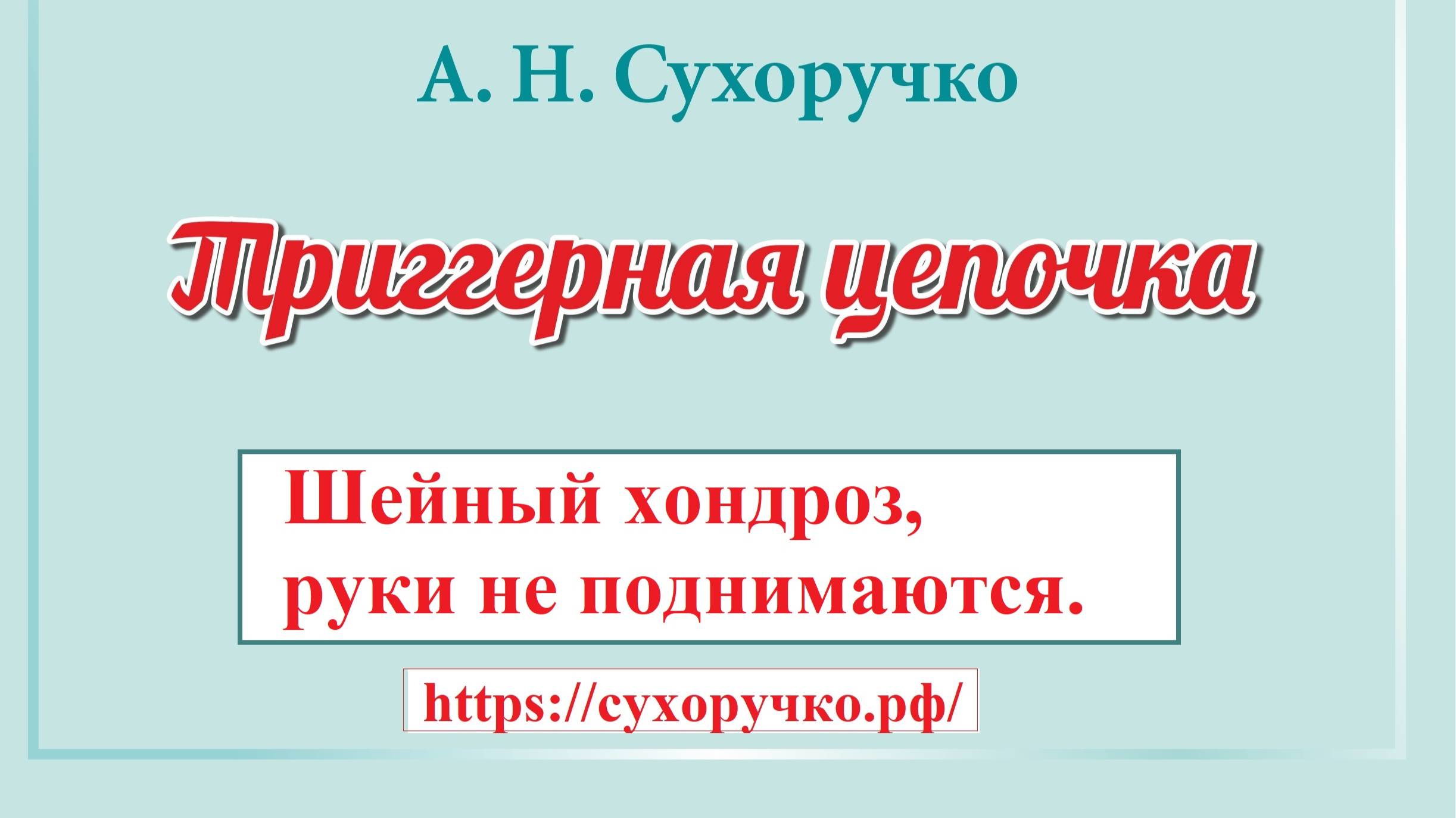 Шейный хондроз, руки не поднимаются. "Триггерная цепочка" Сухоручко А.Н. - это русская инновация оздоровления организма, без: неврологии, лекарств, МРТ, УЗИ, нейрохирургии, остеопатии, мануальной терапии, костоправства, тренажёров. Триггерная цепочка устанавливает диагноз, определяет тактику оздоровления и профилактики; устраняет боли, головокружение, онемение; восстанавливает и укрепляет работу позвоночника, суставов; вертикализирует осанку. Почувствуй легкость, энергию, силу — без мигрени, грыжи диска, остеохондроза, невралгий, артроза, сколиоза, панической атаки! Подробней читать в книге А.Н. Сухоручко "Триггерная цепочка. Энциклопедия здоровья позвоночника и суставов" / сайт сухоручко.рф
