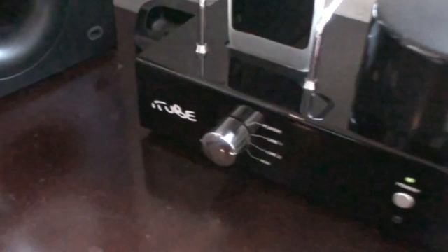 Imac som afspiller gennem NuForce DAC, Fatman ITube carbon 2 og Kef Q15.2 højtalere.