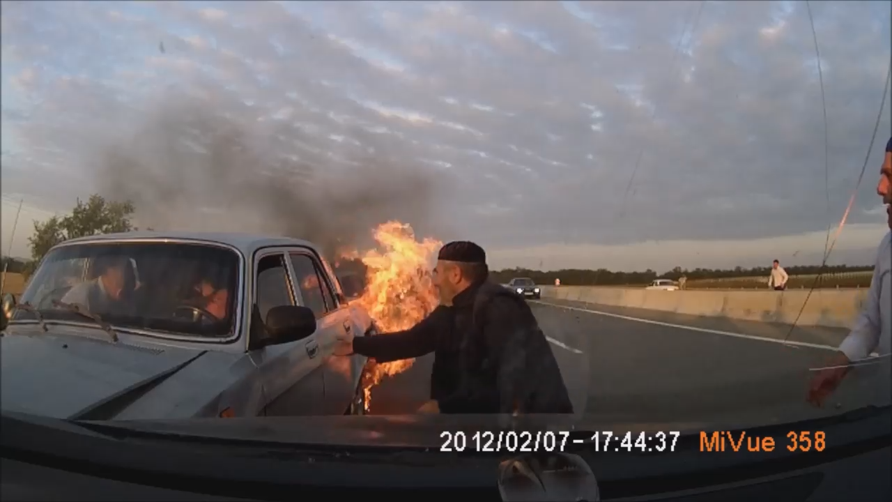 На трассе в Ингушетии произошла авария, а следом за ней вторая, которая оказалась намного серьезней - у пострадавшей машины загорелся бензобак, а люди в ней оказались заперты. По счастью очевидцы аварии не испугались и вытащили людей оттуда.