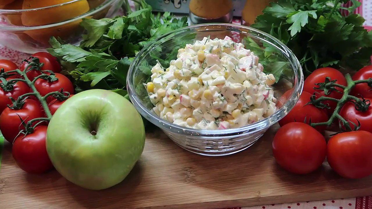 Вкуснейший салат с крабовыми палочками, яблоком и кукурузой